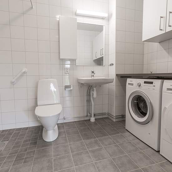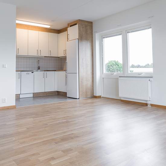 Bostad BADHUSET 2 Fastigheten Badhuset har fått ta över gamla brandstationens tomt, där finns två fyravåningshus med 32 lägenheter. Lägenheterna är ljusa med hög standard avseende såväl utrustning som inredningsdetaljer. Samtliga lägenheter är utrustade med diskmaskin i kök samt tvättmaskin och torktumlare i badrum. Alla lägenheter har balkonger respektive uteplatser på bottenvåningen. Rymliga lägenhetsförråd finns i separat byggnad. Denna lägenhet har uteplats istället för balkong då det är markplan. Bilderna är tagna på en likvär...
