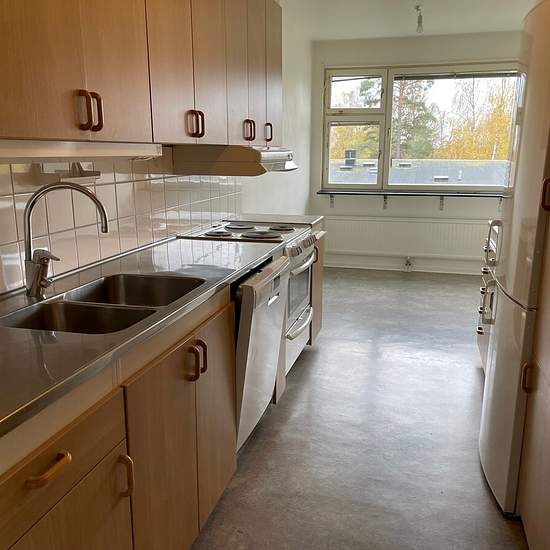 Ljus och fräsch lägenhet med ljusa väggar och golv . Kök med bokfaner luckor, ny kyl/frys, plattspis och diskmaskin, finns plats för ett stort köksbord. Sovrummet med en hel vägg med garderober. Vardagsrum med utgång till balkongen , ingång till kök och hall. Vi reserverar oss för eventuella fel i annonsen.