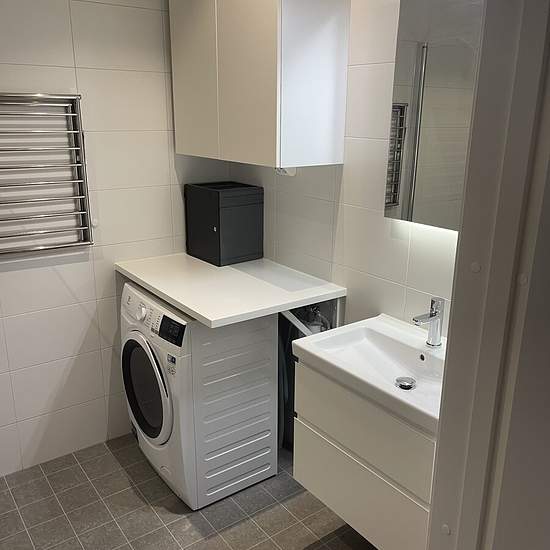 I badrummet finns dusch, tvättmaskin med kombinerad torktumlare.