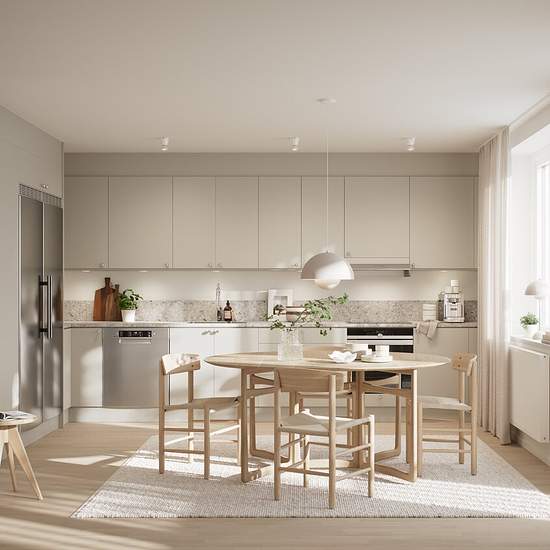 Bostad Svanenmärkta hyresbostäder i varierande storlekar från 1 till 5 rum och kök. Oavsett om du vill bo själv, är sambo eller påväg att bilda familj så kommer du här finna ett boende som passar just dig. Välplanerade och öppna planlösningar med gott om ljusinsläpp. Vi har valt ut färger, material och detaljer som gör det lätt att skapa en egen och personlig känsla. Köken som går i en grön eller beige kulör kommer från Vedum och är utrustade med diskmaskin, ugn och induktionshäll. Alla vitvaror kommer i rostfritt utförande. De större b...