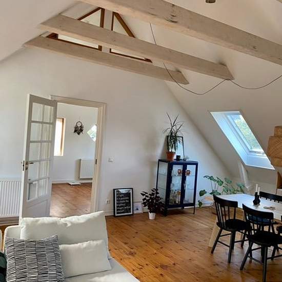 Loftvåning på 80 kvm (golvyta 110 kvm). Stor vardagsrum och sovrum och mysigt kök. 1 trappa. Värme ingår i hyran. Serviceavgift för hyresgäst: 608