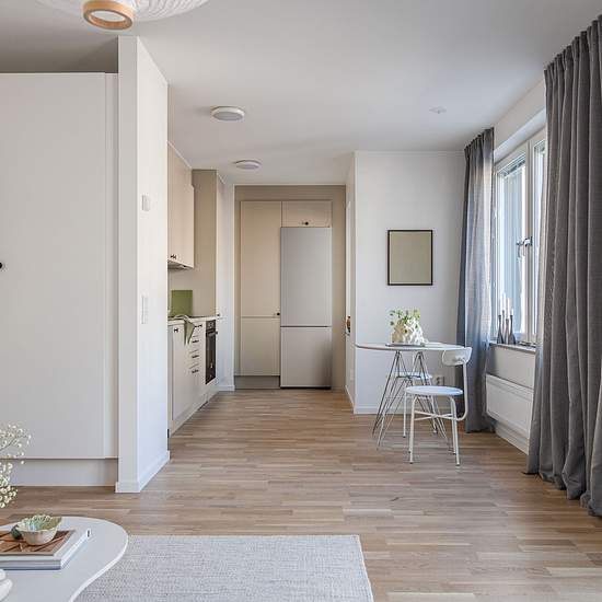 Välplanerad tvåa med fransk balkong och fönster åt två väderstreck! Välkommen till ditt nya hem i ett modernt och smakfullt bostadsprojekt med lägenhetsstorlekar från 1 till 4 rum och kök. Majoriteten utgörs av yteffektiva ettor och tvåor, men för dig som söker något extra finns även rymliga fyrarumslägenheter i etage med härlig radhuskänsla. I hallen möts du av ett praktiskt klinkergolv och goda avhängningsmöjligheter. Genomgående vitlaserad ekparkett och ljusa väggar skapar en stilren och harmonisk helhet. Köket från Marbodal förenar...