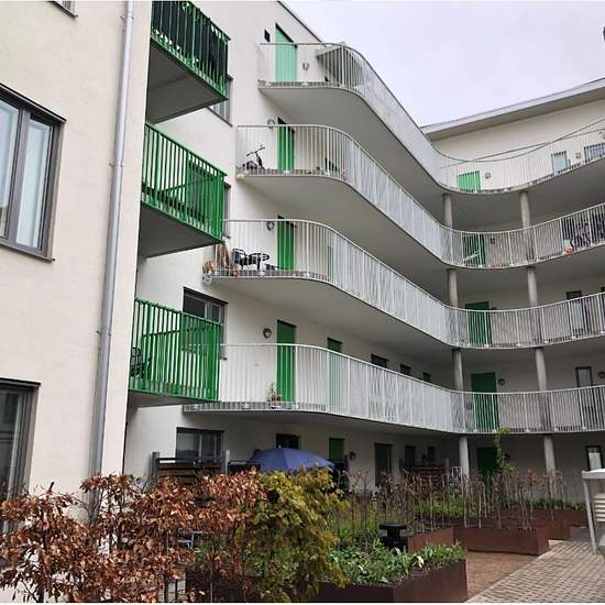 I huset finns det finns allt från ettor om 38 kvadrat till fyror om 102 kvadrat. Huset har tegelfasad mot gatan och ljust målad betongfasad mot innergården. På gården finns gemensamma ytor med grus, marktegel och betongsten. Alla lägenheter har balkong eller uteplats av varierande storlek. Dessa har eluttag och belysning. Uteplatser med sittgrupper, grill, odlingslådor, lekredskap, naturlek och fruktträd/buskar. Servicestation för cyklar och boulebana. Det finns också ett miljöhus på gården. Lägenheterna om 1–2 och 2,5 rum och kök har kombin...