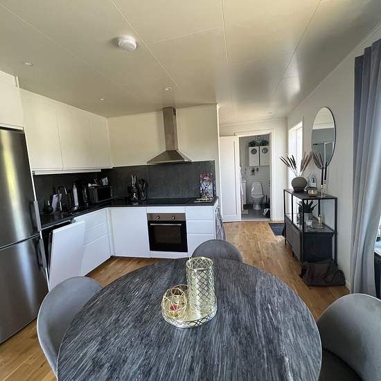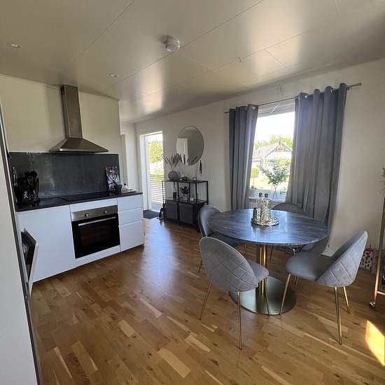 Trevlig lägenhet, i ett mindre hyreshus om två lägenheter. Totalrenoverat för tre år sen. Lägenheten går i ljusa kulörer med genomgående parkettgolv. Fräscht badrum. Gemensam tvättstuga i källare. Plats för en bil på uppfarten.