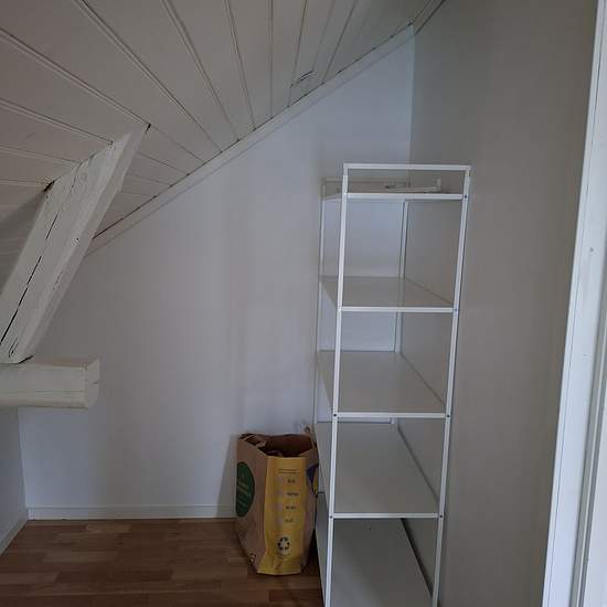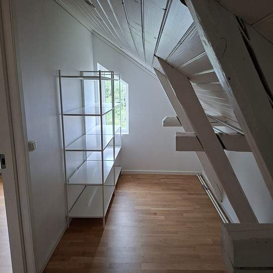 En superfin vindsvåning med öppen planlösning. Kök och vardagsrum med generösa ytor. Sovrum med en stor klädkammare.