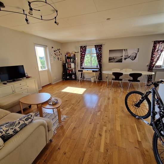 2 rum och kök, lugnt läge in mot gård, öppen planlösning, balkong i västerläge, ny tvättmaskin, spis, kylskåp. Stor trädgård och gräsmatta. Ljus med gott om fönster i 3 riktningar. Mycket fint läge med närhet till skola, badplats, osv. inom 5-10 min gångavstånd, 50m till ICA, 100m till busshållplats, fina naturområden och sjöar i området, ca 20 min körning till Hallandsåsen. Parkeringsplats ingår och garageplats finns för uthyrning. Värme, varmvatten och sophämtning ingår. Serviceavgift för hyresgäst: 404