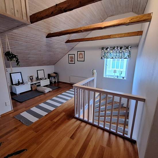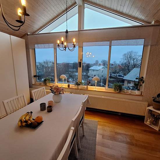 Något utöver det vanliga! Mycket rymlig och ljus vindslägenhet om ca 120 kvm centralt i Skara. Egen ingång och trappa som leder upp till tredje våning. Öppen planlösning med fönster i alla väderstreck. Rymlig hall som övergår i matplats, kök och vardagsrum. Kök med spis, fläkt, kyl, frys och diskmaskin. Stor del av lägenheten har högt till tak och sluttande ateljétak med synliga takbjälkar. Sovrum åt norr. Badrum med dusch och kombinerad tvättmaskin/torktumlare. Det finns också bastu i anslutning till badrummet. Separat toalett. Genomgående ...