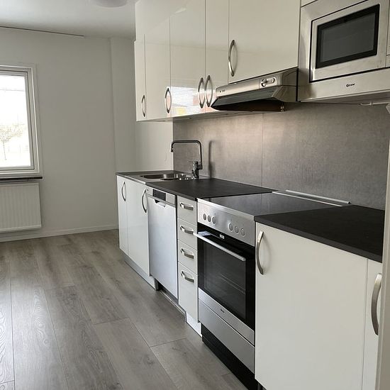 Lägenheten är ca 62 kvm, har ljusa väggar och på golvet vitlaserad ek. Totalrenovering pågår. I köket kommer att finnas kyl och frys, diskmaskin, inbyggd mikrovågsugn och fläktkåpa - allt detta i rostfritt stål. Tåliga bänkskivor i mörkgrå kompositsten. Spis med glaskeramikhäll. Badrummet helkaklat med praktiska duschväggar i glas, golvvärme, tvättmaskin och torktumlare. Det finns balkong, tillhörande förråd och gemensam tvättstuga. TV-leverantör: ComHem, ingår i hyran. Lägenheten ligger på våning 2. Fastigheten är belägen på området Valhal...