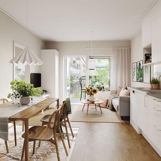 Välkommen hem till en nyproducerad 2:a med genomtänkt planlösning och moderna materialval. I entrén möts du av öppen planlösning med klinkergolv. Väggarna är målade i en ljusgrå ton och golvet pryds av ekparkett från Kährs. Det stilrena köket från Marbodal har vita luckor och är utrustat med diskmaskin, kyl och frys, samt ugn och spis med keramikhäll. Badrummet har kakel och klinker, handdukstork och en duschhörna med glasväggar. Dessutom ingår egen tvättutrustning i bostaden – praktiskt och bekvämt i vardagen. Planlösning och omgivning Här ...