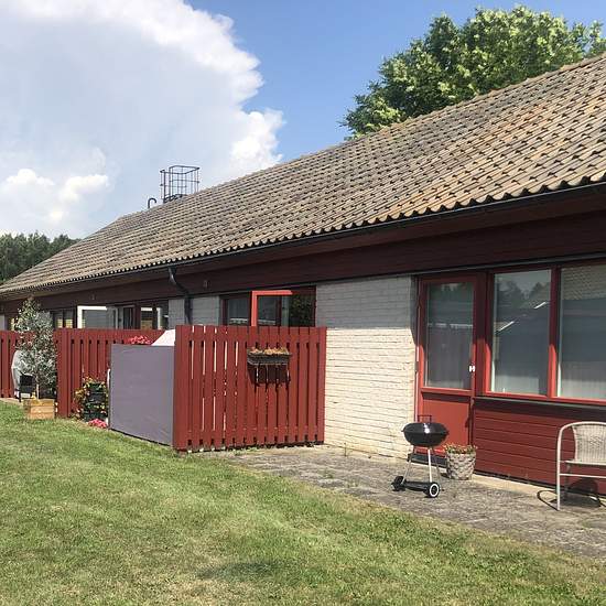 Bostad Marklägenheter med trädgård eller uteplats Kök med plats för köksbord och upp till 2-3 stolar. Vardagsrum med utgång till uteplats, sovrum med stora fönster för bra ljusinsläpp. Lägenheterna har genomgående vita väggar, vardagsrummet och sovrummet har parkett. Badrummet har plastmatta på golv och vägg i ljusa färger. I köket finns en plastmatta i ljusa toner. Liten hall med plastmatta. Lägenheten renoverades 2025 med nya golv och nytt badrum, samt alla väggar målas Förråd i anslutning till lägenheten i källarplan. Tvättstuga i...