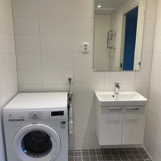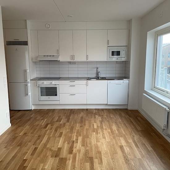 Nyproducerad lägenhet sedan december 2023. Vitmålade väggar och parkettgolv. Kök med vita köksluckor, kakel, mikrovågsugn och diskmaskin. Badrum med grått klinker på golvet, vitt kakel på väggar, dusch med stång för draperi, handdukstork, kombinerad tvättmaskin och torktumlare, kommod under handfat och spegel med belysning ovanför. Lägenheten har balkong. Förråd beläget i separat gårdshus. Värme: Ingår i hyran. El: Hyresgästen tecknar eget elabonnemang. Kall- och varmvatten: Kostnad tillkommer retroaktivt på hyresavierna. TV/bredband/t...