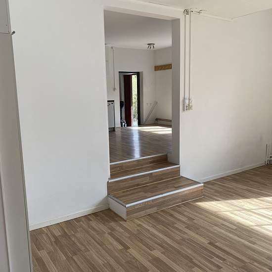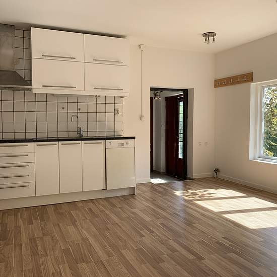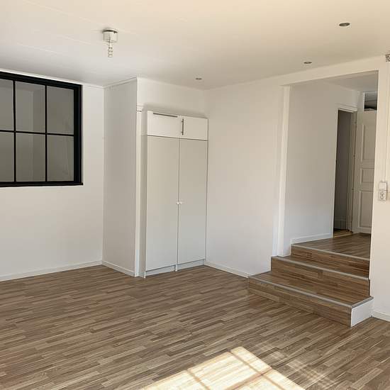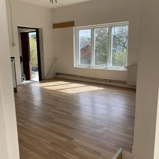 Nyproducerad 2 R o k i Etage. En mycket trevlig och speciell "studiolägenhet" uthyres i Slite. Från trapphuset i bv, går man in i det övre planet där kök,badrum,matplats ligger. Man går sedan ner några trappsteg tall det stora ljusa vardagsrummet med stort industrifönster ut mot trädgården. I anslutning till vardagsrummet når man sovrummet som också har ett stort industrifönster. Stort exklusivt kök med rostfria vitvaror. Ny rostfri kyl/frys ( ej på bild) Kaklat badrum. Rikligt med förvaring. Spotlights i taket i hela vardagsrummet.Ekparkett...