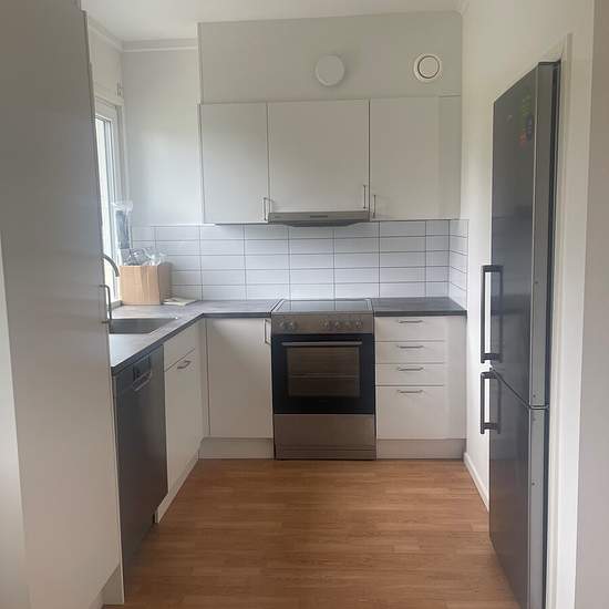 Just nu får du 1000 kr i hyresrabatt/ månad och fri garageplats under första året! En nyrenoverad 2 RoK med genomgående hög och modern standard. HALL Välkomnande hall med svart entrébeläggning, vita väggar och golv i parkettgolv. BADRUM Lägenheten har ett nytt, ljust helkaklat badrum utrustat med dusch, handdukstork, golvvärme, handfat med kommod samt spegel med belysning. I badrummet finns även tvättmaskin. KÖK Nytt och modernt kök med rostfria vitvaror, antracitgråa bänkskivor och glaskeramikhäll. Luckorna är vita med stilrena stå...