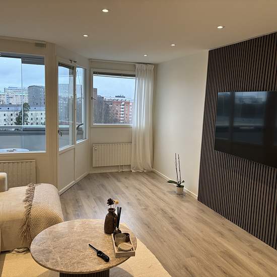 Nyrenoverad bostadsrätt uthyres i Solna – 55 kvm, våning 6 Hyr ut en nyrenoverad och stilfull bostadsrätt om 55 kvm på sjätte våningen (6/8) på Krysshammarvägen 38 i Solna. Lägenheten är delvis möblerad. (Säng och soffa) Bostaden har ett ljust och rymligt vardagsrum, nyrenoverat och fullt utrustat kök samt en bekväm sovdel. Dimbar spotlightbelysning finns i hela bostaden förutom toaletten. Badrummet är fräscht men inte renoverat. Stambyte kommer att genomföras i fastigheten under cirka 8–9 veckor med start i början av mars i år. Under den...