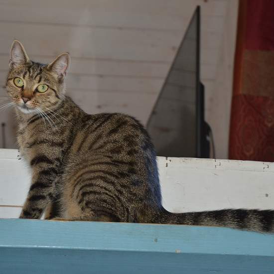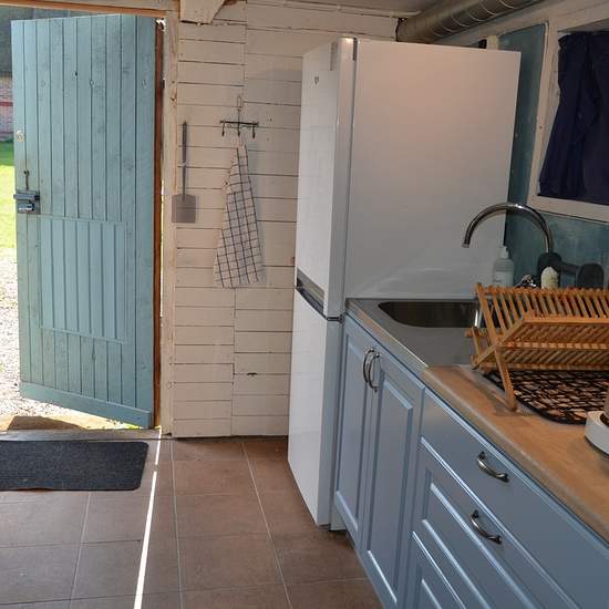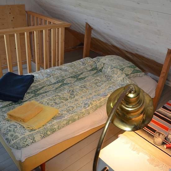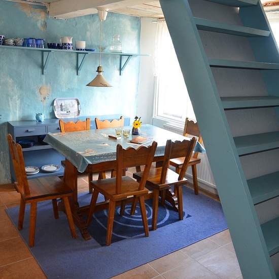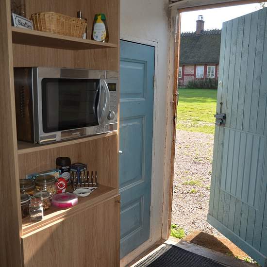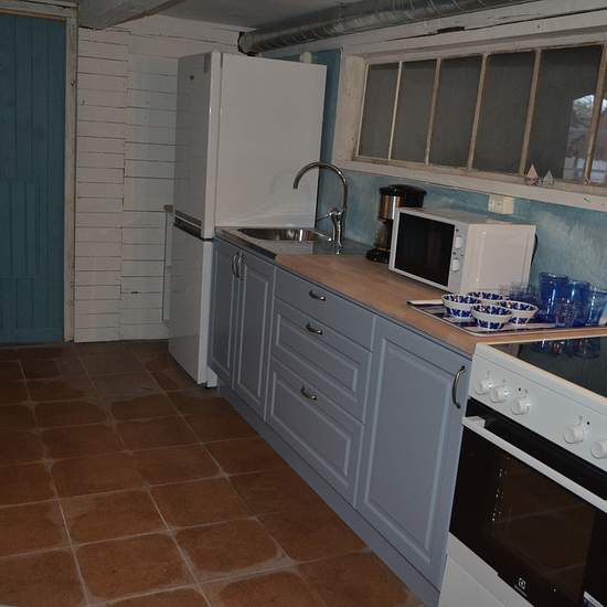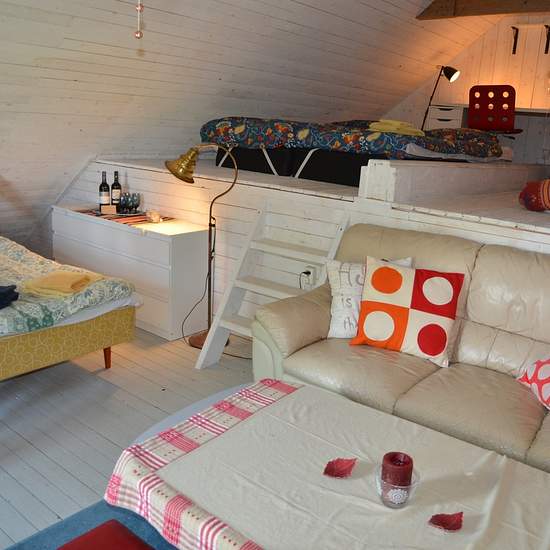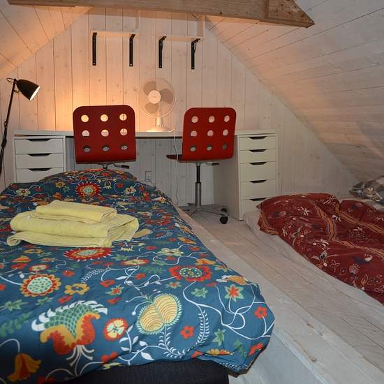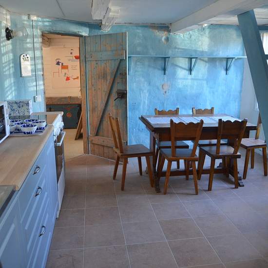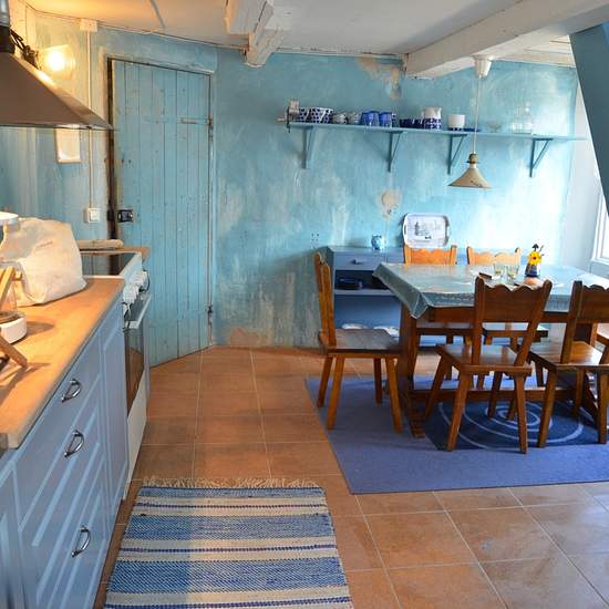 Bostaden är spännande och annorlunda - den måste ses! Köket är allmogeblått och nygjort, men den gamla stilen med stallampa mm har bevarats. Köksutrustning kan ev ordnas vid önskemål. Från köket kommer man upp till ovanvåningen via en blå trätrappa. Där finns dels ett vardagsrum, dels ett sovloft en liten trappa upp. (Dessa foton visar inte aktuell möblering.) Bostaden kan hyras ut antingen möblerad, delvis möblerad eller ev helt omöblerad i överenskommelse med värd. Gästen får vara beredd att själv ombesörja att oönskade möbler bärs upp...