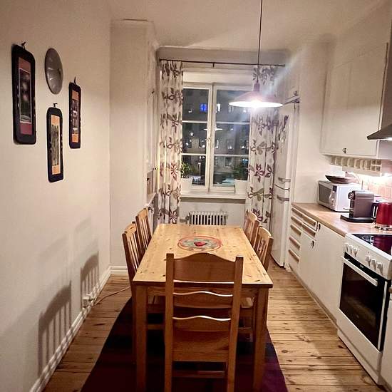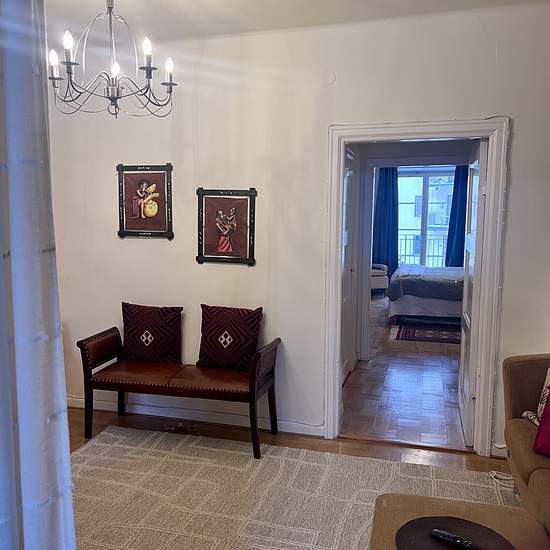 Enjoy living in a lovely flat (72 m, 2.5 room) in the heart of Stockholm city. Apartment is spacious and open with plenty of natural light. The kitchen comes complete with an eat-in breakfast nook. The apartment comes fully furnished, with kitchen appliances and kitchenware, living room furniture and a king size bed in the primary suite. In the den, there is an expansive workstation which makes working from home very comfortable. Also, in the den, is a queen-size pull-out sofa for your guests. The primary suite has a walk-in closet and there...