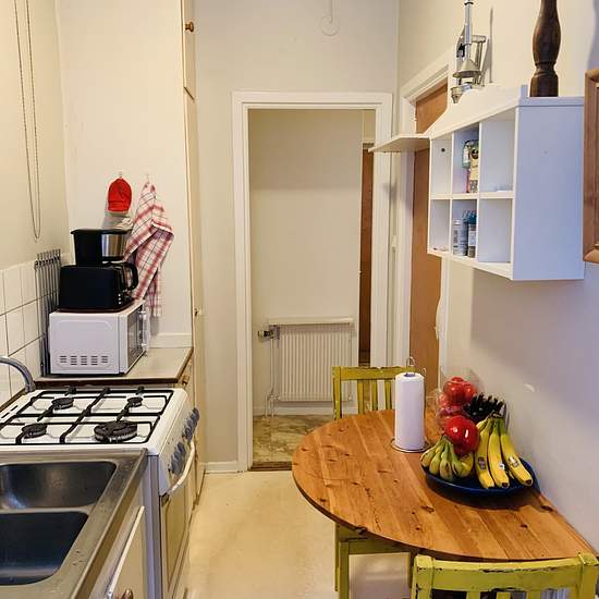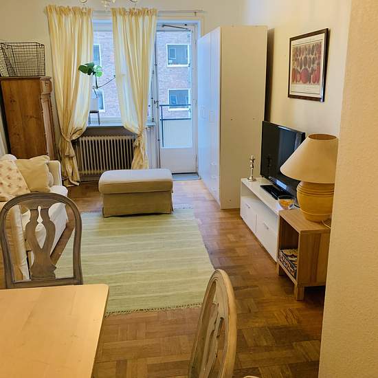 Välplanerad tvåa för en till två vuxna med eller utan barn uthyres pga studier på annan ort. Alla rum är relativt nymålade. Köket är original men har nytt kylskåp och ganska ny ugn. Lägenheten uthyres fullt möblerad med allt man behöver. Sängen kan fällas ut eller ihop till en dubbel- eller enkelsäng och soffan i vardagsrummet är en bäddsoffa med plats för två. Balkongen är rymlig och hopfällbara möbler samt matta, filtar mm. till den finns. Gott om parkering finns tillgänglig precis utanför på gatan och även laddning för elbil finns. Sk...