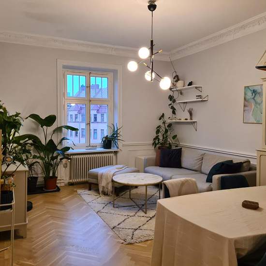 (Information also available in English below) Vi hyr ut en välplanerad tvåa på 54kvm med högt läge (våning 5) och fin balkong med sol från morgon till eftermiddag i populära Vasastan och omtyckta Rörstrandsgatan runt hörnet. Bostaden erbjuder ett stort vardagsrum och sovrum med stora fönster och en rejäl takhöjd. Den passar 2 vuxna (+1 barn). Möblerna kommer vara kvar i lägenheten medans växter och andra inredningar som syns på bilder kommer tas bort. Lägenheten renoverades 2019-2020 med ett nytt påkostad kök, nymålad väggar och fiskbens...