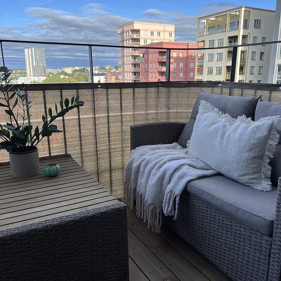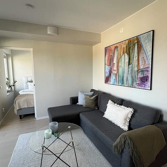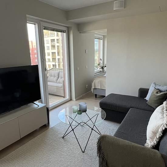 Lägenheten om 35kvm är nyproducerad, ljus och genomtänkt med smart planlösning. Här bor du högt upp i huset med utsikt och lugnt läge. Lägenheten är fullt möblerad med allt du kan tänkas behöva för en smidig och trivsam vardag: - Sovrum med skön säng - Vardagsrum med soffa och matbord med två stolar - SmartTV - Balkong om 3kvm, möblerad för sköna kvällar - Fullt utrustat Marbodal kök med köksverktyg samt Siemens diskmaskin - Helkaklat badrum med golvvärme och Simens kombi-tvättmaskin och torktumlare - Golvvärme i hela lägenheten, - Bredban...