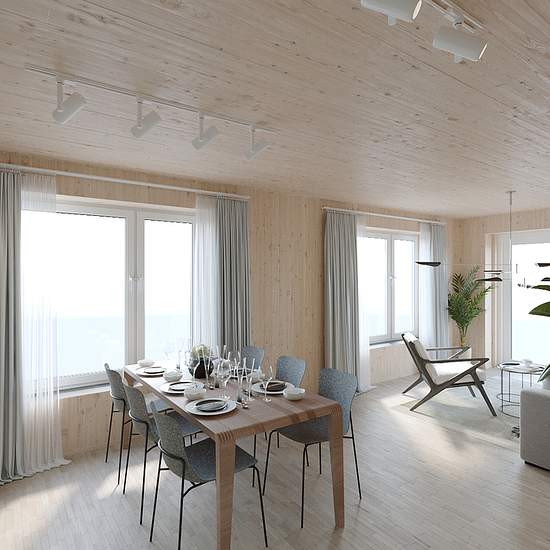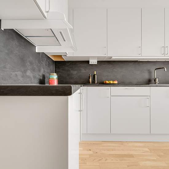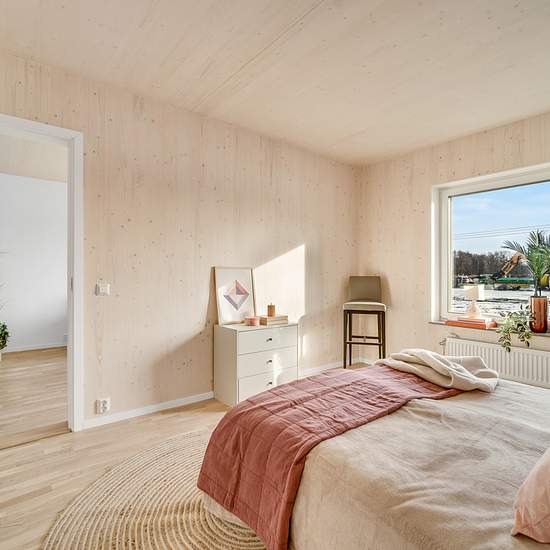 Entréhallen har ett praktiskt klinkergolv medan de andra rummen har en ljus, vitlaserad trestavsekparkett. Köket är sobert färgsatt med släta, vita luckor och dörrar med köksbänk och stänkskiva av tåligt laminat. Vitvarorna kommer från Electrolux eller likvärdigt varumärke. Fönster och fönsterdörrar har treglas med fönsterbänkar i vacker natursten. Innerdörrar och garderober är vita för att harmonisera med de fräscha, vita innerväggarna som ger en perfekt canvas för dig som vill skapa ditt egna drömboende. Badrummen är välutrustade med wc, d...