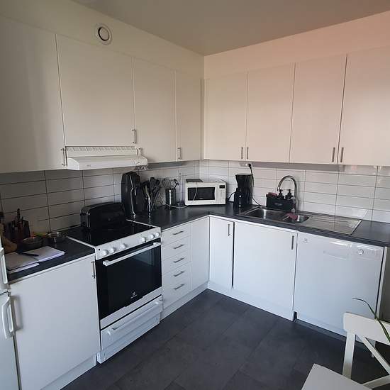 Bostad Tvårummare med uteplats. Kök från 2020 med vita köksluckor och mörk bänkskiva. Här finns spis med glashäll samt diskmaskin. På golvet ligger klinker. Badrummet renoverades 2022 och är helkaklat med vitt kakel på väggarna och grå klinker på golvet. Här finns dusch, handdukstork samt tvättmaskin och torktumlare. I sovrum, hall och vardagsrum ligger parkettgolv. I vardagsrummet kommer ny parkett att läggas innan inflyttning. Säkerhetsdörr finns. Bilderna på köket är från den aktuella lägenheten. Bilden på badrummet är en exempelbil...