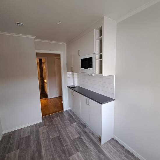 En 2 rum och kök med sovrum och kök mot innergården och vardagsrum mot Södra Drottninggatan. Lägenheten har ett bra planerat kök med diskmaskin och micro. Badrummet är helkaklat med duschhörna och förberett för tvättmaskin. Ekparkett i hall, vardagsrum och sovrum. Balkong mot gatan.