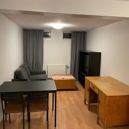 Lägenhet i källarplan på friliggande villa med egen ingång uthyres möblerat. Två rum (sovrum + vardagsrum) med köksdel och eget badrum. Badrummet är fräscht och har dusch, WC och tvättmaskin. Kök/pentry med bl.a. kyl, frys, mikro och bänkspis med ugn. Lägenheten ligger i ett lugnt villakvarter med skogen runt hörnet och med goda möjligheter till rekreation och motion. Nära till hållplats för Stadsbuss som till centrum tar ca 15 minuter och med cykel på bra cykelvägar tar det ca 20 min. Affär (ICA), pizzeria mm finns i närheten. Rökfritt oc...