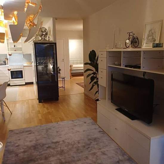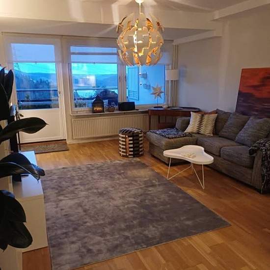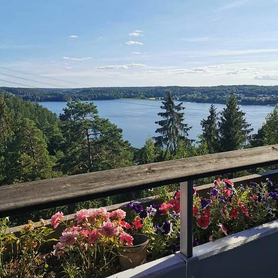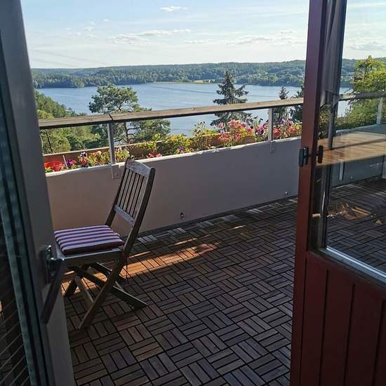 Nyrenoverad 2,5 rums lägenhet för 1-2 personer på Erskin-designade Myrstuguberget i Vårby, 73 kvadrat lägenhetsyta, med stor (18 kvadrat) terass och fantastisk utsikt över Albysjön och skogarna runt Flottsbro. Fiberinternet med WiFi, TV, garageplats, vatten och värme ingår, el tillkommer. Nära till tunnelbanan (Masmo, röda linjen) och buss. Serviceavgift för hyresgäst: 833