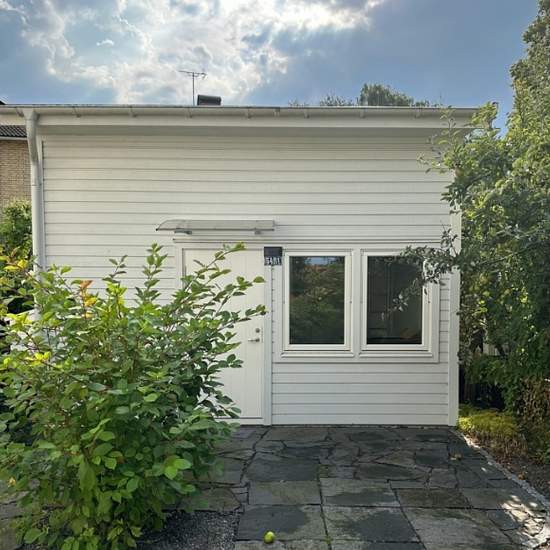 Attefallshus på vår tomt. Hyrs ut fullt möblerad med bl.a. skrivbord, soffa och TV. Huset har dusch, eget badrum och kök med kylskåp, spisplattor och mikrovågsugn. Tvättmaskin och torktumlare finns i bostaden. Djur- och rökfritt hem. Barnvänligt och tillgänglig för personer med funktionsnedsättning. Ingår i hyran: El, värme, varmvatten, vatten, sophämtning, internet och TV med betalkanaler. Gata Parkeringsmöjlighet. Lugn och trygg omgivning med bra kollektivtrafik till centrum. Passar för en person eller ett par. Inflyttning möjlig omgående
