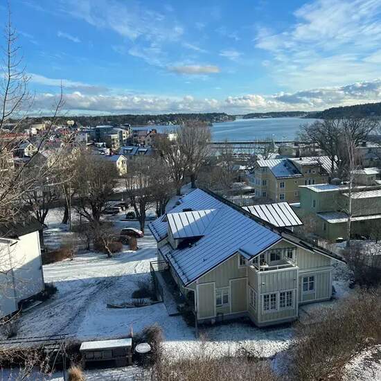 Beskrivning Charmig vindslägenhet med sjöutsikt och kakelugn i vackert sekelskifteshus i centrala Vaxholm med bästa läget. Lägenheten har rymliga rum med vidsträckt sjöutsikt åt tre håll. Härifrån ser man gamla Vaxholm, kastellet, hamnen, Vaxholms inlopp och alla närliggande öar. Det finns två stora klädkamrar i lägenheten, samt väl tilltagna vinds- och källarförråd. Lägenheten kommer att vara nyrenoverad vid inflyttning (nymålad, nya golv, delvis renoverat badrum och kök). Huset har nio lägenheter och ligger i Officersparken som har stor tr...