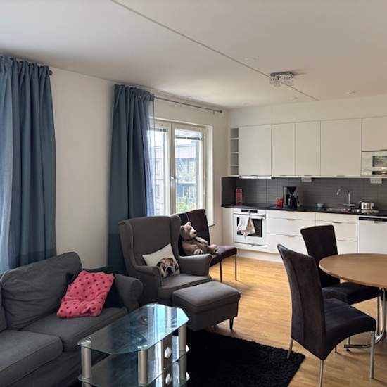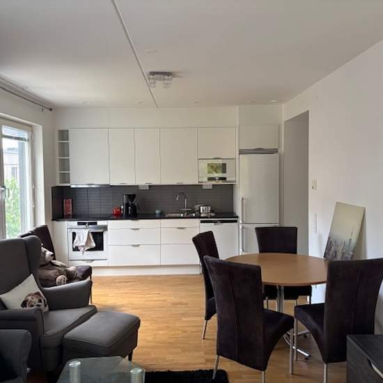 En nybyggd modern 2-a, 5 min till pendeltåget till T-centralen som tar 20 min dit. Uthyres fullt möblerad till ett par eller ensamstående. En mycket liten bostadsrättsförening, en stor balkong och sovrum vetter mot ett berg/träd, ingen insyn. Serviceavgift för hyresgäst: 654