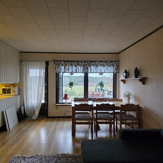 Fritidsboende året om uthyres. Öppen planlösning med stort vardagsrum och matplats. Ett stort sovrum med dubbelsäng, sant ett mindre sovrum. Stort soldäck med utgång från vardagsrum och huvudentré. Badrum med dusch och tvättmaskin. 10 minuters bilfärd till badplats. 30 minuter till Vingåker factory outlet. 20 min till Finspångs centrum. 10 minuter till närmaste kiosk. Tv finns, dock ingen bredband. Boxer kan ordnas om det önskas. El tillkommer med 900 kr/ månad. Parkering finns på tomten. Garage ingår ej, kan hyras med tillägg på 200...
