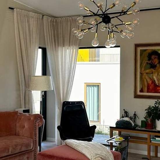 Huset, byggt för fyra år sedan, erbjuder 185 kvm och har en terrass samt en täckt utomhusmatsal med sjöutsikt från vardagsrummet och de flesta sovrum. Den öppna planlösningen och stora fönster ger ett ljus och inbjudande hem. Det finns: • Master bedroom med eget badrum och walk-in closet • Barnrum med plats för fyra sängar • Hemmakontor som kan användas som sovrum • Gästrum med queensize-säng och eget badrum • TV-rum Utomhus: • Stor trädgård med grillmöjligheter och badplats nära • Säker plats för barn och vuxna att koppla av Perfekt läge...