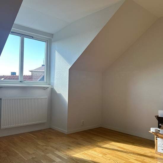 Välkommen till denna ljusa och charmiga lägenhet högst upp i huset med vacker utsikt över takåsarna. Lägenheten har genomgående fint parkettgolv, vitmålade väggar och snedtak i alla rum som ger en mysig karaktär. Köket är utrustat med kyl och frys i fullhöjd, vita köksluckor samt en keramikhäll med varmluftsugn. Här finns gott om plats för både matbord och stolar. Badrummet är helkaklat med vita väggar och ljusgrått klinkergolv. I sovrummen finns bra förvaringsmöjligheter. Lägenheten ligger i Eneborg/Högaborg, sydöstra Helsingborg, endast ...