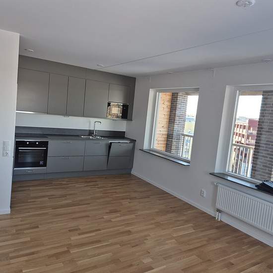 Möjligt att hyra depositionsfritt genom Samtrygg. Månadskostnad: 14950 kr. ________________________________________________________________ Snabbast bokar du visning genom att följa denna länk till Samtrygg: Här hittar du även fler bilder och mer info. ________________________________________________________________ Ny och välplanerad 3:a på 6:e våningen med stor balkong och fri utsikt. Belägen i attraktiva och snabbväxande Barkarbystaden. Fem minuters gångväg till T-banestationen som öppnar 2027. Bostaden har genomgående stilrena mat...