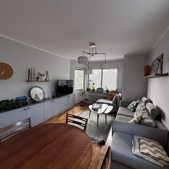 Vi hyr ut vår ljusa och välplanerade trea på 60 kvm under perioden då vi arbetar på annan ort (Sundsvall) preliminärt i ca 2 månader då den tidigare hyresgästen flyttat. Lägenheten ligger på tredje våningen (hiss finns) med fönster i två väderstreck och balkong i västerläge. Lägenheten består av ett ljust vardagsrum med utgång till balkongen, ett kök med gott om förvaring, två sovrum samt ett helkaklat badrum utrustat med tvättmaskin. Spjälsäng och skötbord kommer att tas bort före inflytt. I vardagsrummet finns en hörnmodul som även funge...