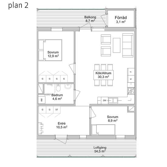 Nybyggd trea med öppen social yta och balkong. Kök i vit färgskala utrustad med spis med glaskeramikhäll, diskmaskin och energisnål kyl och frys. Rymliga sovrum med bra förvaring. Allrum och kök har en öppen planlösning och trevlig för socialt umgänge. Lägenheten har genomgående ekparkett och vitmålade väggar. Badrummet har kakel och klinker, och är utrustad med kombitvättmaskin. Förvaring i hallen med garderober och städskåp samt hatthylla. I hyran ingår värme, fastighetsskötsel och ett basutbud av TV-kanaler. Vatten och el mäts individue...