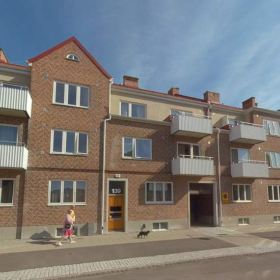 Trevånings bostadhus med hyreslägenheter i östra delen av Landskrona. Närhet till skolor, tågstation och övriga kommunikationer. Handdukstork Säkerhetsdörr