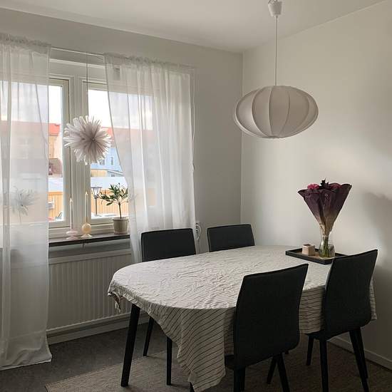 Fin lägenhet med 3 rum och kök samt balkong. Vita väggar. Parkett i sovrum och vardagsrum. Helkaklat badrum. Vita luckor i köket. Induktionshäll och varmluftsugn, diskmaskin. Förberett för tvättmaskin i badrummet. 2 st fina tvättstugor i källaren, cykelrum och förråd.