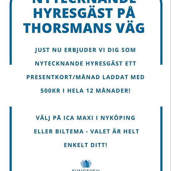 Modern och luftig lägenhet men öppen planlösning i ett trevligt område som ligger centralt, men ändå med närhet till fina grönområden och promenadstråk. Den stora balkongen blir en naturlig förlängning av vardagsrummet - perfekt för både avkoppling och sociala stunder. Gångavstånd till olika butiker och goda bussförbindelser. Nära till puls och utbud, men utan att vara mitt i smeten. Just nu får du som nytecknande hyresgäst på Thorsmans väg ett presentkort på 500kr/månad i ett helt år, på antingen Ica Maxi Nyköping eller Biltema. Hyra enli...