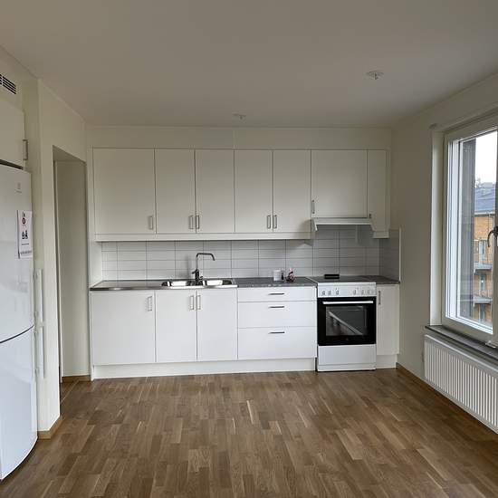 Välkommen till en nyproducerad lägenhet med genomgående hög och modern standard! HALL Välkomnade hall med svart entré beläggning som sedan övergår till trägolv. Vita väggar, säkerhetsdörr samt garderob. KÖK Ett modernt kök med laminat bänkskiva, vita luckor med stilrena stålhandtag. Köket är utrustat med kyl/frys, hällspis samt fläkt. BADRUM Lägenheten har ett helkaklat badrum utrustat med dusch, handduks tork på el, handfat samt spegelskåp med belysning. I badrummet finns även tvättmaskin och torktumlare alt. kombinerad tvätt och tork. ...