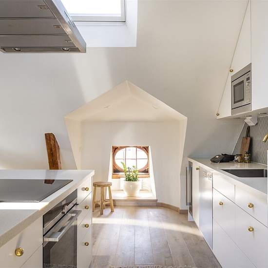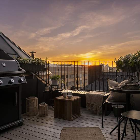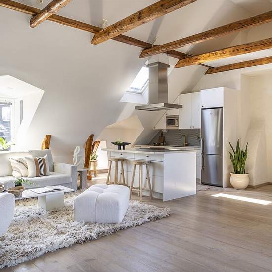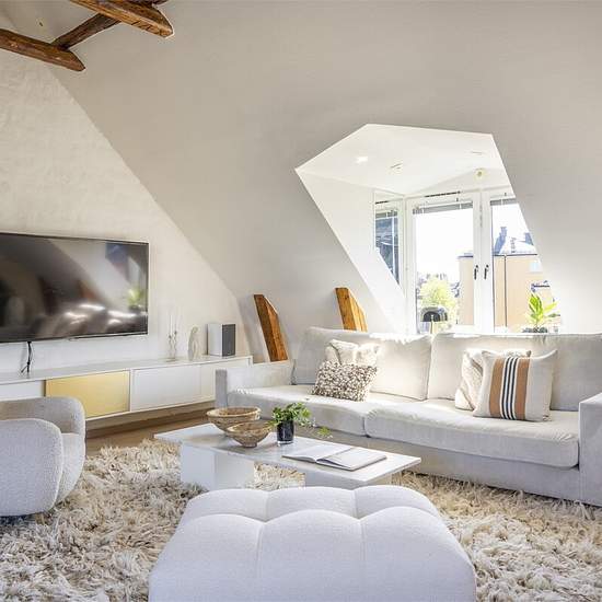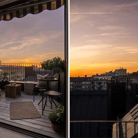 Stylish Rooftop Apartment 1-Month Stay Welcome to this exceptionally charming rooftop apartment with a terrace offering breathtaking views of the sky and rooftops of Stockholm. Enjoy sunshine from midday until sunset. Inside, you'll find a bright, open-plan living space with a soaring 4-meter ceiling, exposed wooden beams, and large windows that flood the space with natural light. The layout is thoughtfully designed to create generous social spaces. The cozy living area flows into a spacious dining area right next to the terrace doors, tha...