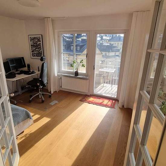 -- English desscription below -- Fräsch renoverad lägenhet i lugnt läge, med ändå med Nytorget & SOFOs fantastiska utbud aldeles nära. Härligt ljus från många fönster i sydvästläge! Lägenehten: Stort vardagsrum med burspråk med härligt ljusinsläpp. Soffa, TV, ljudanläggning. Middagsbord för minst sex. Sovrum 1: Master bedroom med nyare 160 kontinentalsäng. Bra garderober. Sovrum 2: Stort sovrum/arbetsrum med säng och skrivbord. Renoverat kök med bra arbetsytor, utrustning och förvaring. Diskmaskin och micro. Fräscht badrum med tvättmas...