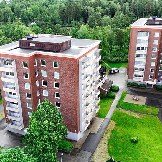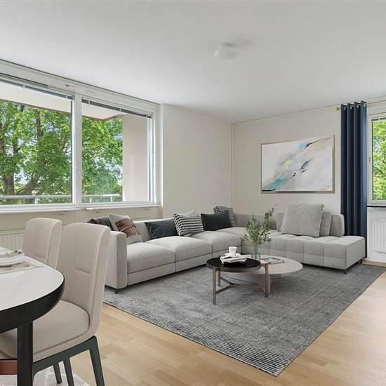 Här erbjuds ett bekvämt och trivsamt boende för paret eller familjen. När du kliver in möts du av en genomgående hall som sträcker sig genom hela lägenheten, med gott om förvaringsmöjligheter i både garderob och klädkammare. Från hallen når du två rymliga sovrum med stora fönster och generöst ljusinsläpp. Det inbjudande vardagsrummet med ljust parkettgolv leder ut till en balkong i sydväst läge, där du kan njuta av den härliga utsikten från sjätte våningen. Köket är praktiskt utformat med en avskild matplats och stora fönster som ger ett här...