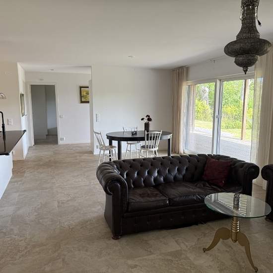 Exklusiv lägenhet i liten skärgårds-brf, invid Kalvfjärden och Tyresö Slott. Fantastiskt soligt söderläge med sjöutsikt, stor privat terass och gräsmatta, endast 30 min med bil till Stockholm. Lägenheten är nybyggd och modern med exklusiva material i badrum och kök. Genomgående inredd med stengolv och golvvärme. Lägenheten är 101 kvm, har 2 sovrum, 2 stora badrum, kök och vardagsrum i öppen planlösning med stor stenlagd köksö, privat tvättstuga, förråd och parkeringsplats. Möblerad. I närområdet finns restauranger, badplatser, aff...