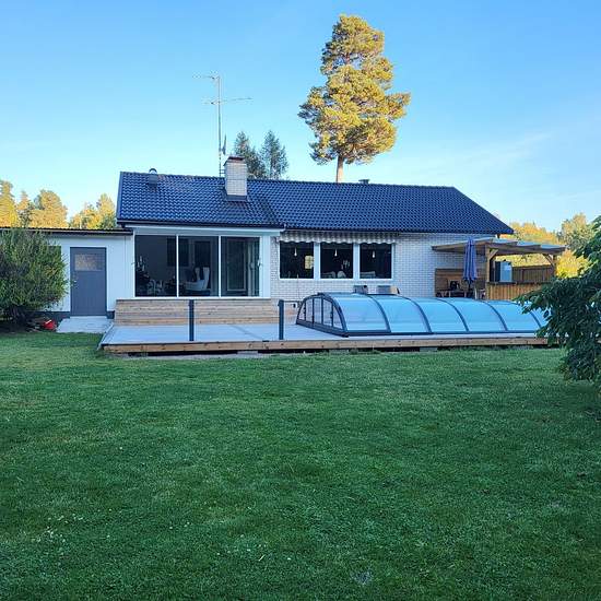 Hyr ut del av huset dvs källarvåning på ungefär 100 kvm. Det finns 2 sovrum, en gillestuga( vardagsrum) med öppen spis, tillgång till biljardbord. Egen toalett dusch och bastu. Tvättstugan delas på. Ett rum dvs ett mindre kök pentry med bord och stolar. Förråd dvs pannrum finns att tillgå. Egen ingång. Huset har uppvärmd pool, spabad och växthus som delas gemensamt. Huset har skogen som granne. Ett perfekt hem för den lilla familjen eller studenter. Finns plats för två studenter. 7000 för studenter. Och 12.000 för övriga. Serviceavgift för...