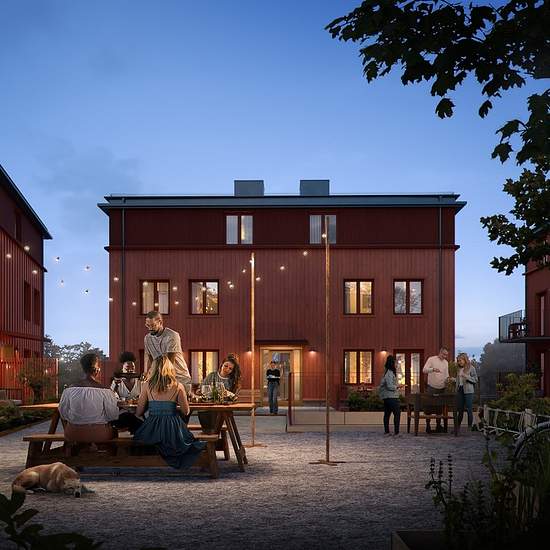 Välkommen till ett nybyggt radhus i två plan med genomtänkta materialval och en harmonisk färgskala. Väggarna är målade i en varm sandbeige ton som passar väl ihop med det ljusa ekparkettgolvet och köket från Marbodal i liknande nyanser. I hallen möts parkett och grå klinker. På entréplan finns golvvärme, medan övre plan värms med radiatorer. Köket är utrustat med moderna vitvaror och har vitt kakel som stänkskydd, vilket ger ett stilrent uttryck. Vardagsrummet erbjuder plats för både soffgrupp och matbord och har dessutom utgång till en ste...