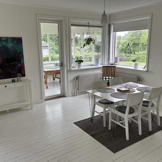 Väldigt trivsam och charmig villa med utsikt över havet och Kurjoviken med småbåtshamn. 3 separata sovrum på övervåningen. Två badrum. Vardagsrum med öppenspis. Inglasad uteplats. Stor gräsmatta. Stor carport. Serviceavgift för hyresgäst: 891