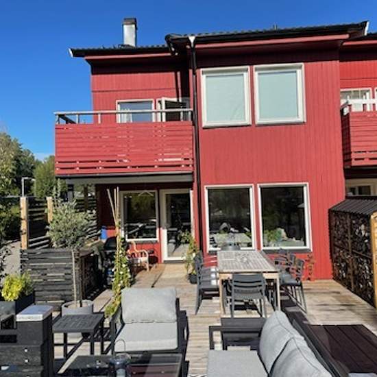 Välkommen till ett mysigt och välskött radhus med 2 uteplatser och en balkong i bästa solläge(baksidan). I detta hus finns gott om plats för både boende och umgänge då det erbjuder två sociala utrymmen - både vardagsrum med värmande braskamin och allrum. Kök med matplats vid fönstret. Vardagsrummet har utgång till trädäckad altan (sol nästan hela dagen). På entréplan finner vi även en WC(under renovering) och tvättstuga. På övre plan finns 3 fina sovrum, allrum och WC/dusch 1 fin balkong som nås via allrum. Förråd på framsidan. Baksidan erbj...