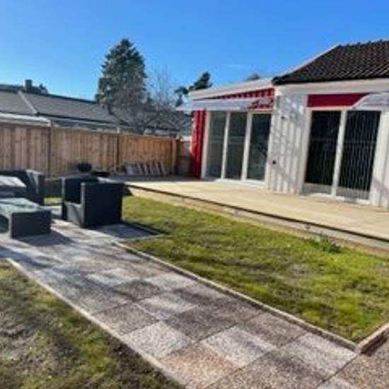 Större del av enplanradhus i väldigt lugnt och grön område , perfekt för barnfamiljer med stor vardagsrum och tre sovrum. Det går att diskutera om företag eller någon vill hyra båda delar av huset. Hela huset är totalt ny renoverad, inom- och utomhus 2023. HALL Välkomnade hall med marmor. VARDAGSRUM Öppen planlösning mot kök. Plats för både matbord och soffgrupp. Ny parkett och nymålade väggar. KÖK Fint Fullt utrustad kök med med nya vita varor :spis/ugn, diskmaskin, fläkt och kyl/frys samt nya skåp. Stor altan med plats för soffgrupp oc...